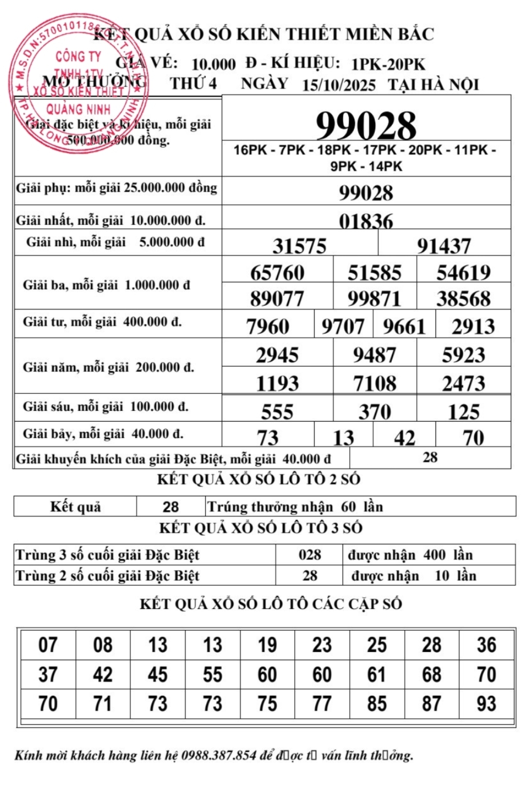 Kết quả ngày 16/10/2025