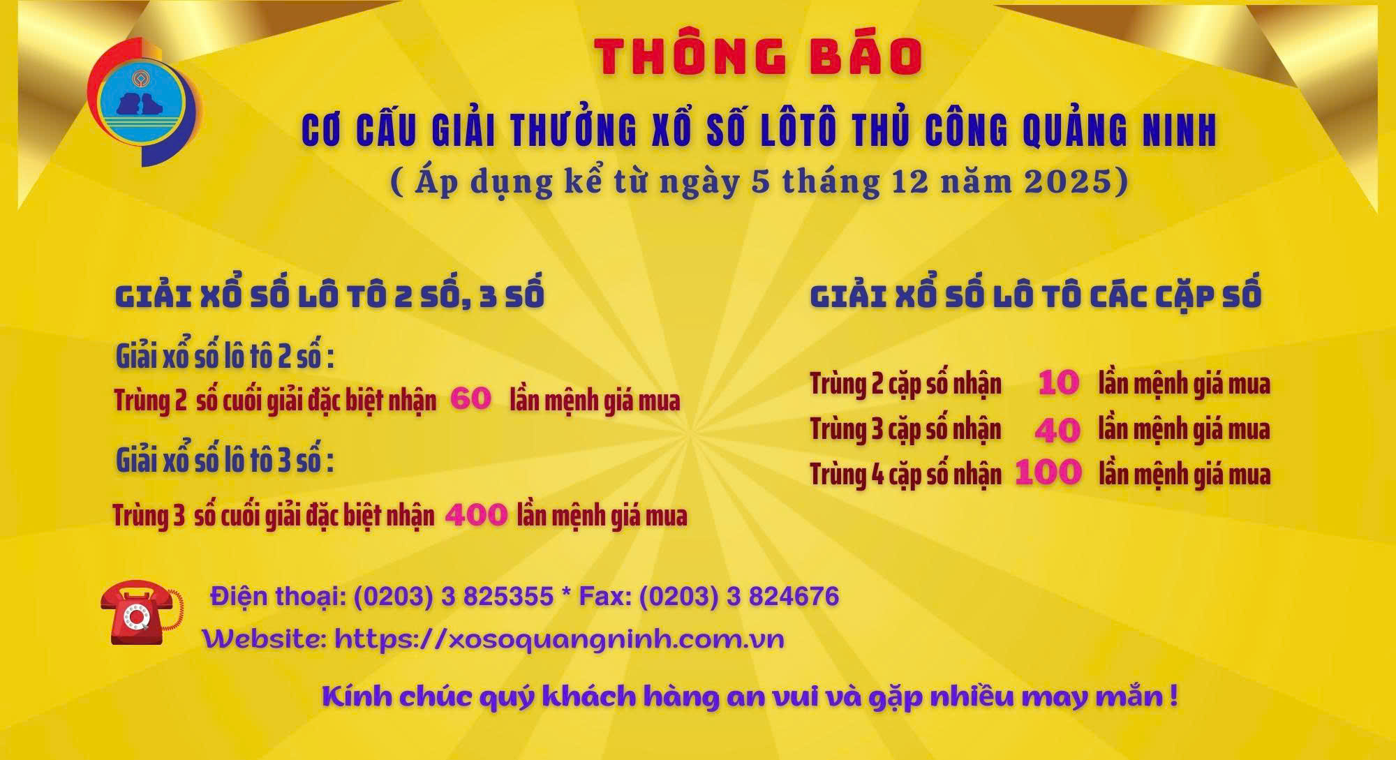 Thông báo về thay đổi cơ cấu giải thưởng loại hình xổ số lô tô thủ công Quảng Ninh từ ngày 05/12/2025
