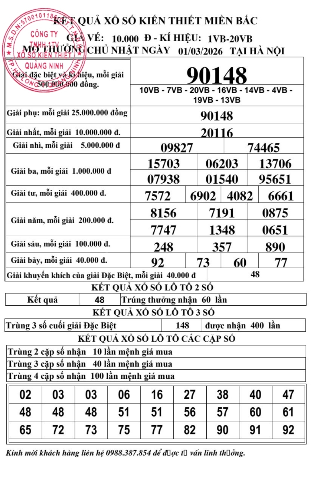 Kết quả ngày 01/03/2026