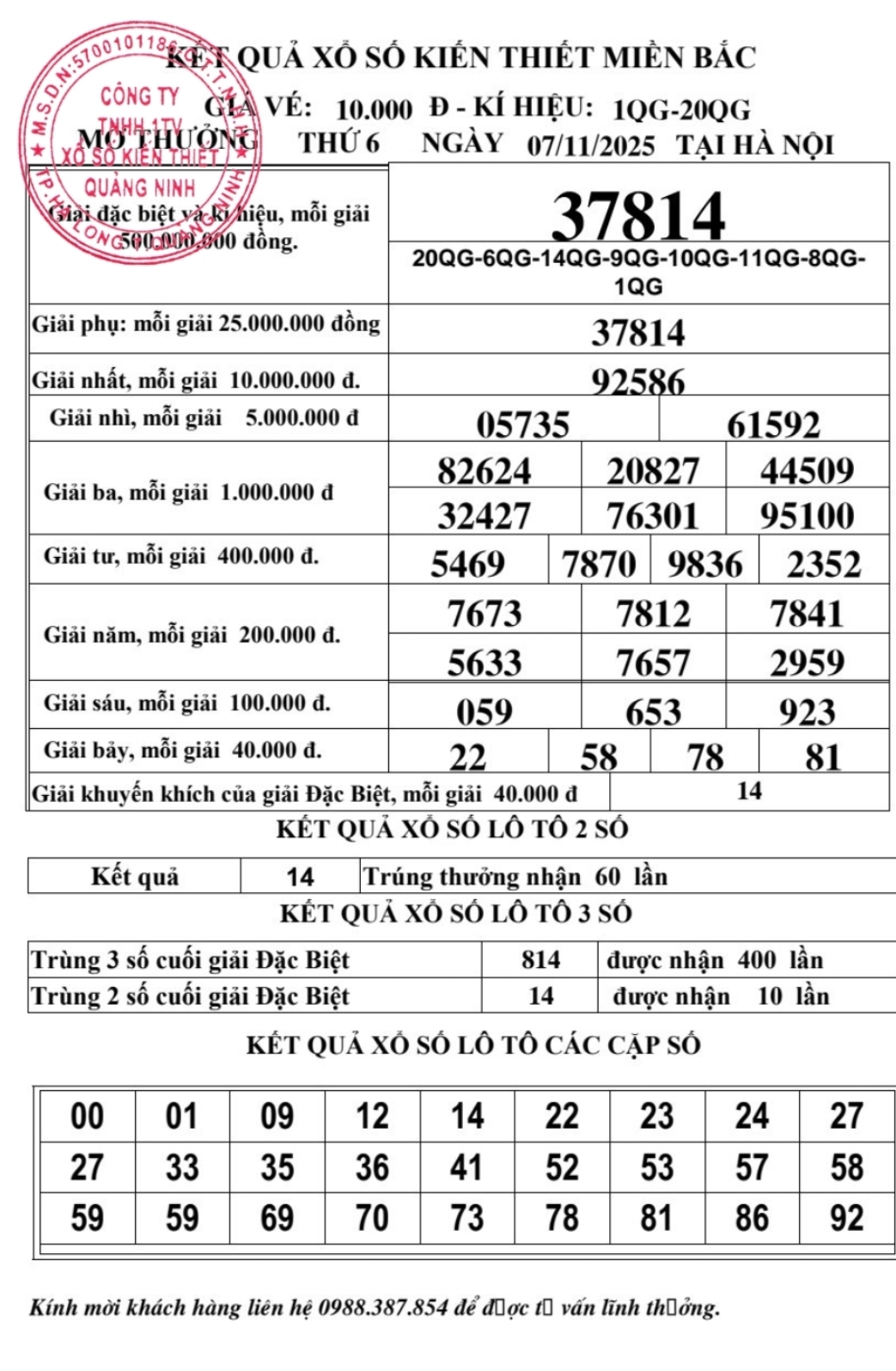 Kết quả ngày 07/11/2025