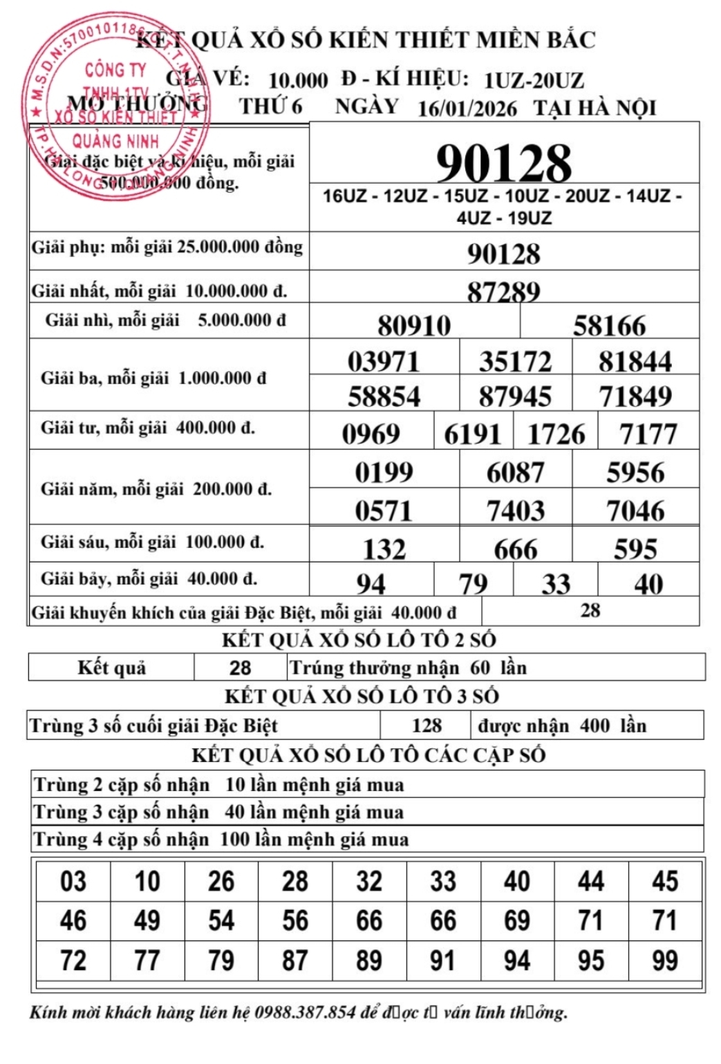 Kết quả ngày 16/01/2026