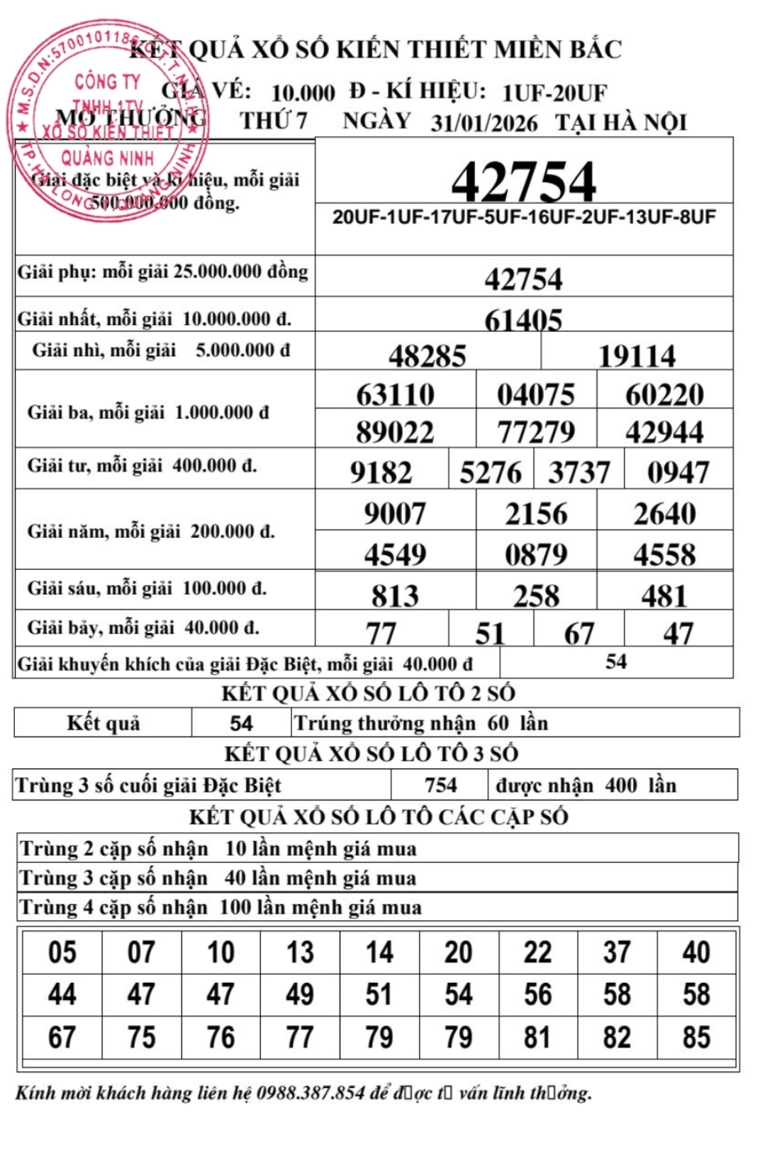Kết quả ngày 31/01/2026