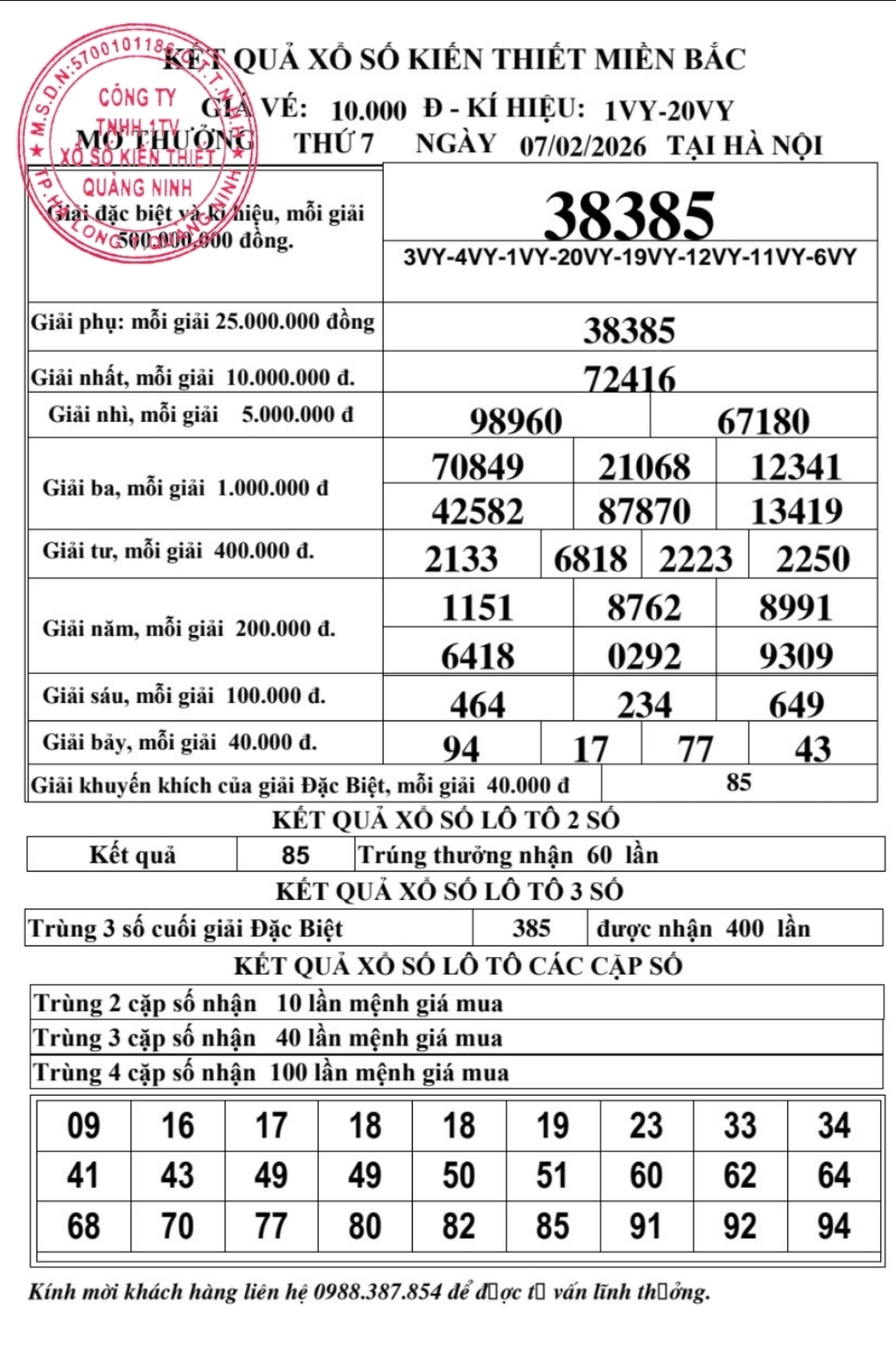 Kết quả ngày 07/02/2026