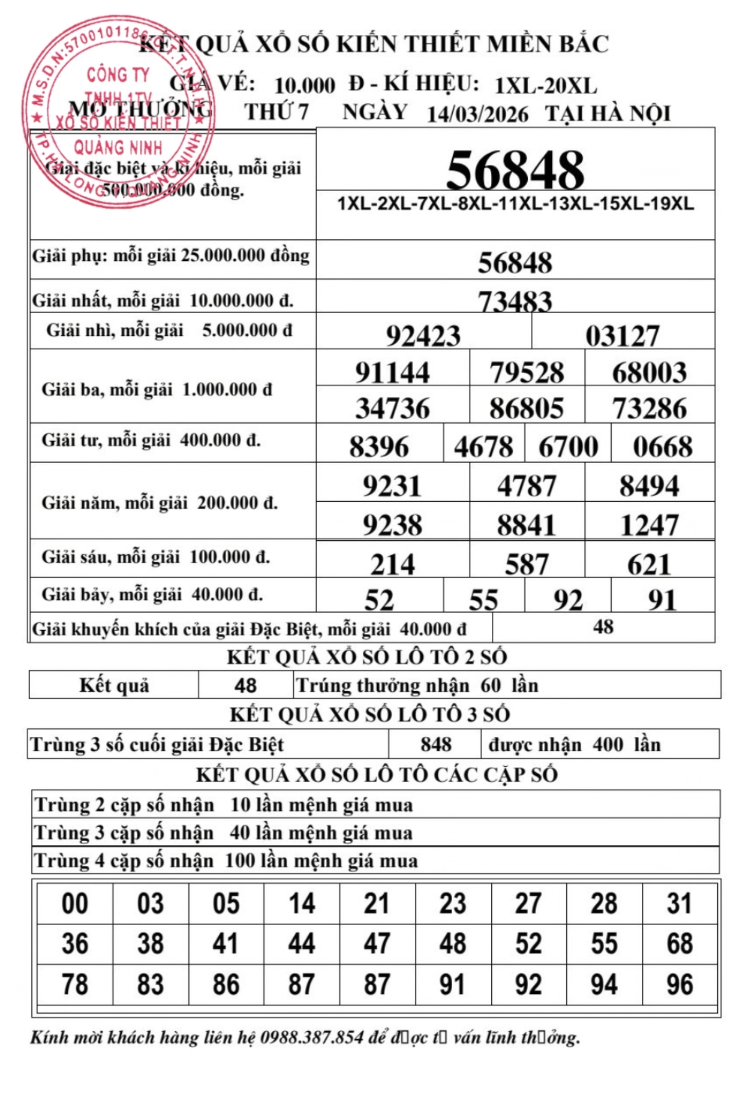 Kết quả ngày 14/03/2026
