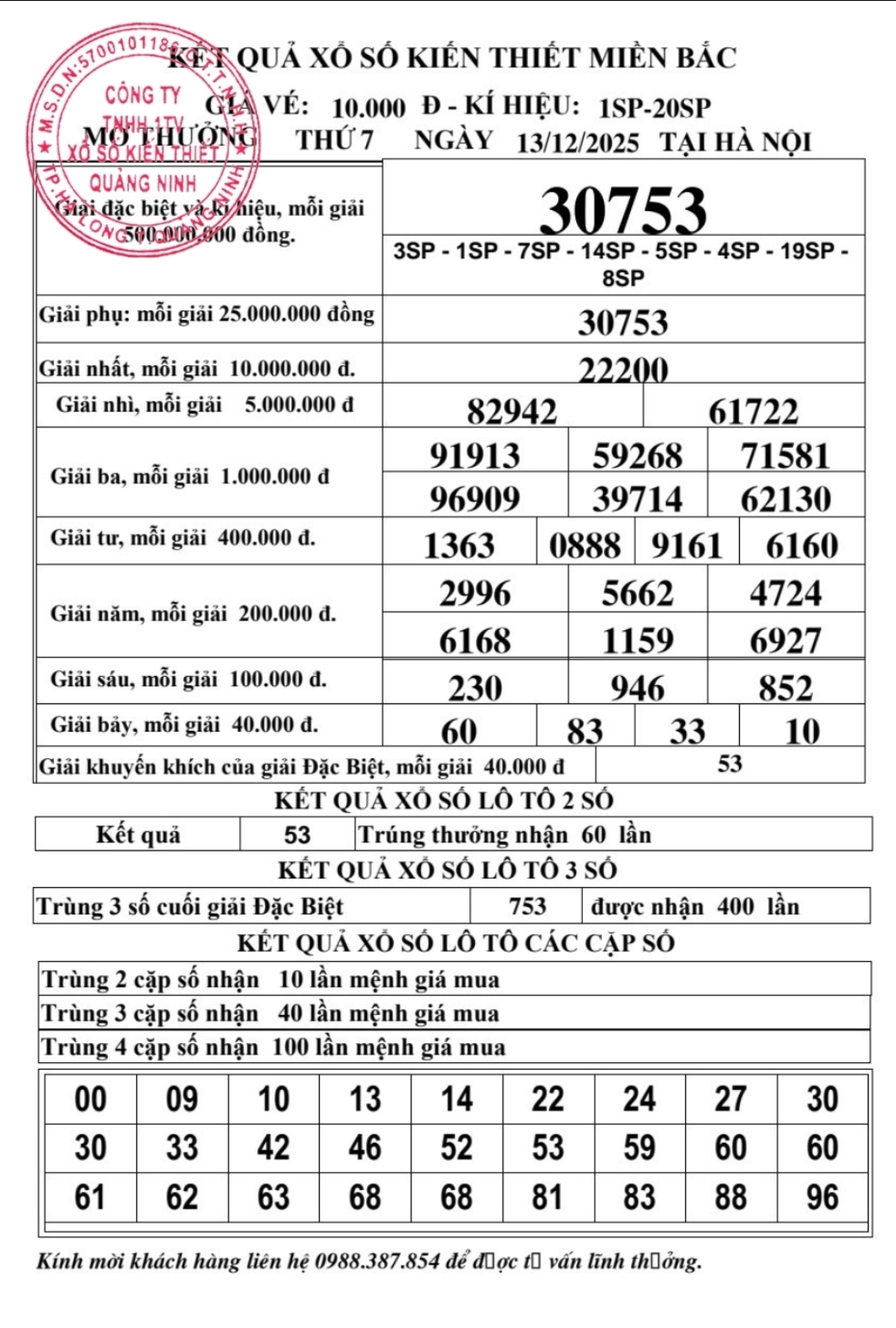 Kết quả ngày 13/12/2025
