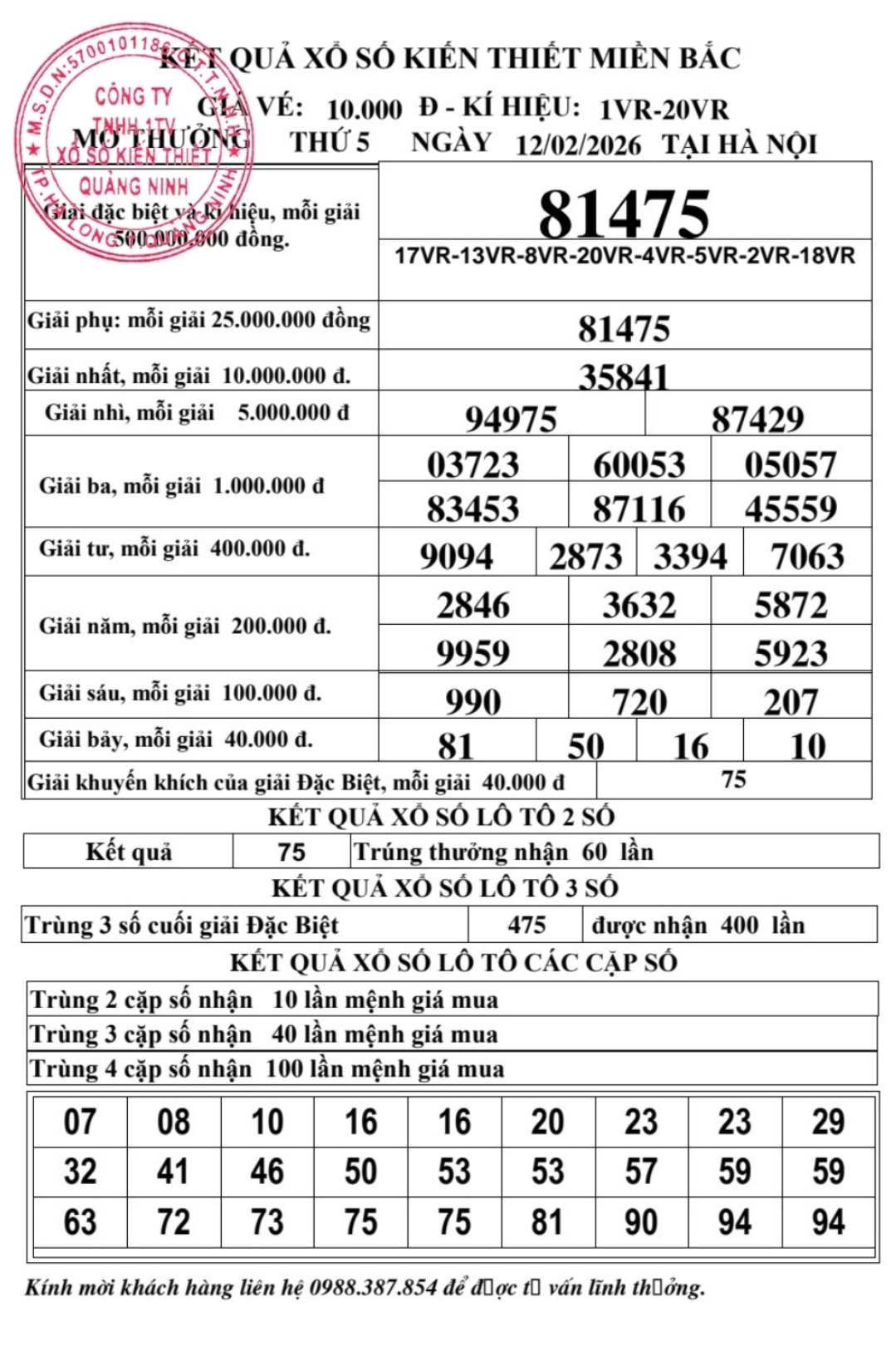 Kết quả ngày 12/02/2026
