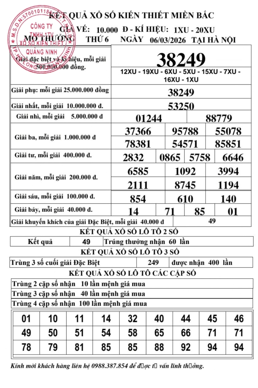 Kết quả ngày 06/03/2026