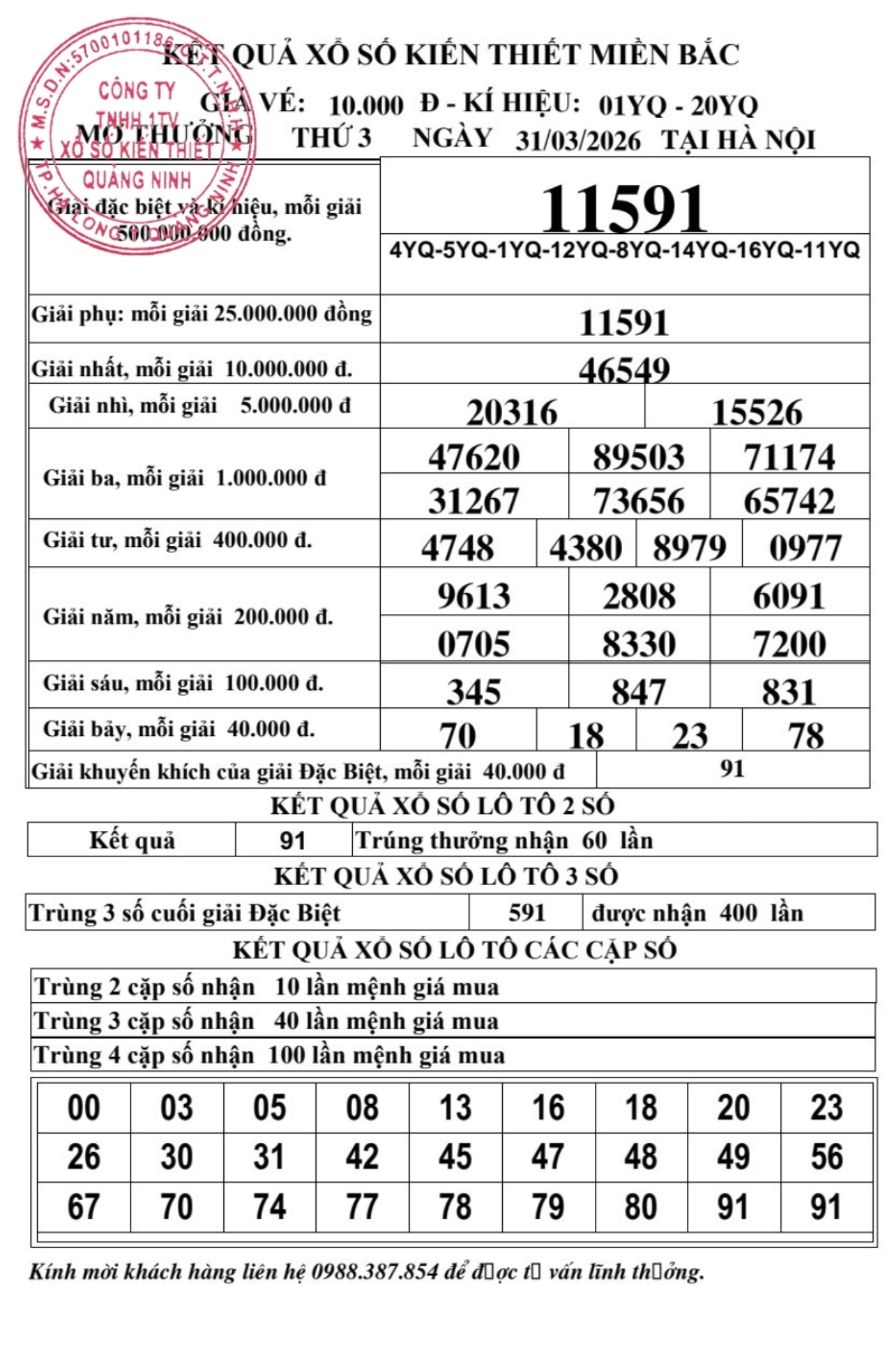 Kết quả ngày 31/03/2026