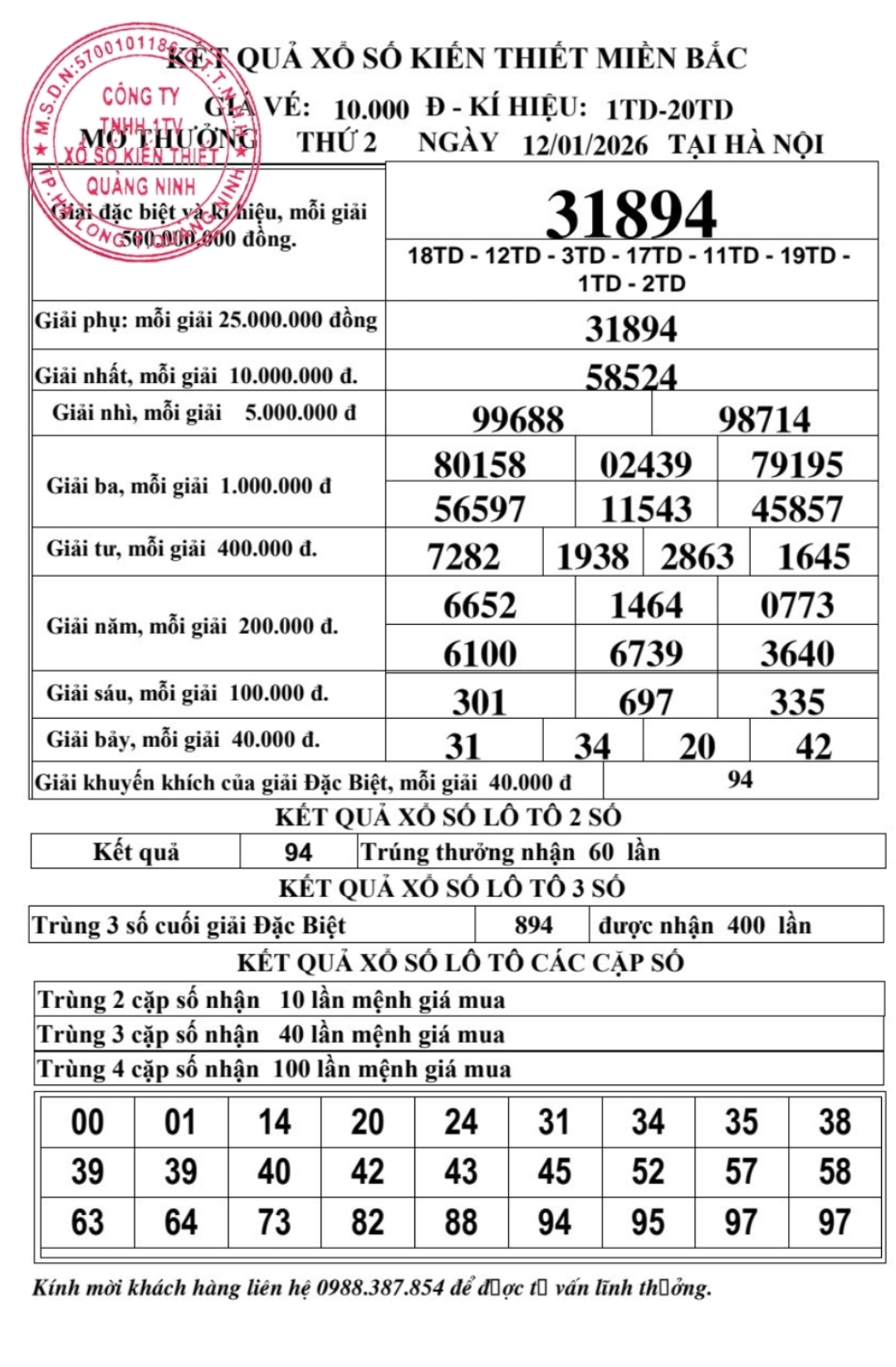 Kết quả ngày 12/01/2026